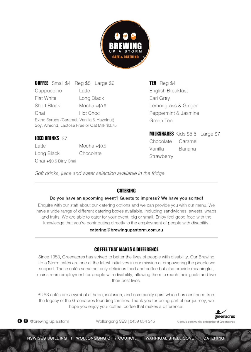 Welcome to Brewing Up A Storm Café SES, a charming café nestled at 93 Burelli St, Wollongong NSW. This delightful spot is not just about great food; it’s an experience that supports a meaningful cause, helping those living with disabilities.